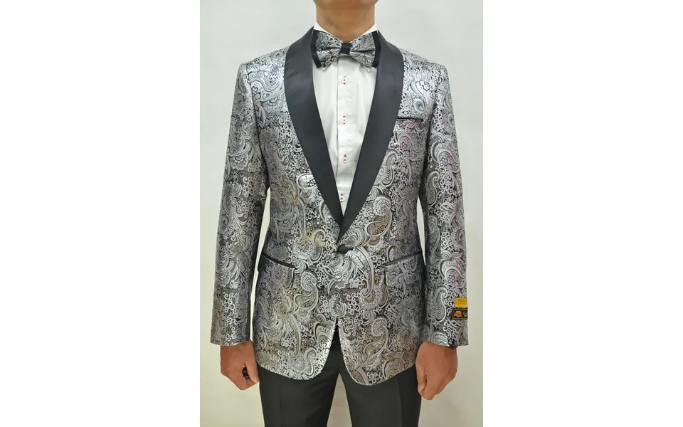 Lapel:satin shawl collar. Fit:modern fit suit. Button:1- cover button. Suit pattern:paisley pattern. Pocket:flap pocket. Chest pocket:1- chest pocket. Suit stitching:interior pic-stitching Brand: AlbertoNardoniStore