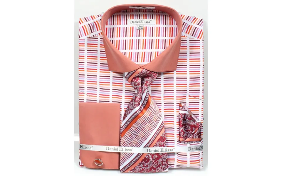 This wide spread collar dress shirt combo comes in a 100% cotton material, features a multi-color horizontal stripe, along with a negative vertical stripe. Features...show more