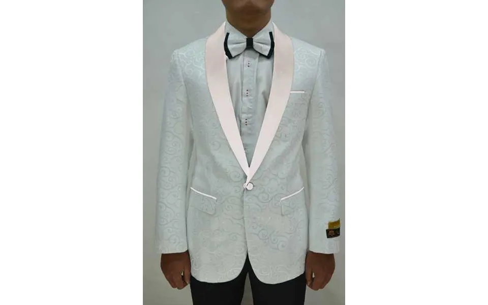 Lapel:satin shawl collar. Fit:modern fit suit. Button:1- cover button. Suit pattern:paisley pattern. Pocket:flap pocket. Chest pocket:1- chest pocket. Suit stitching:interior pic-stitching Brand: AlbertoNardoniStore