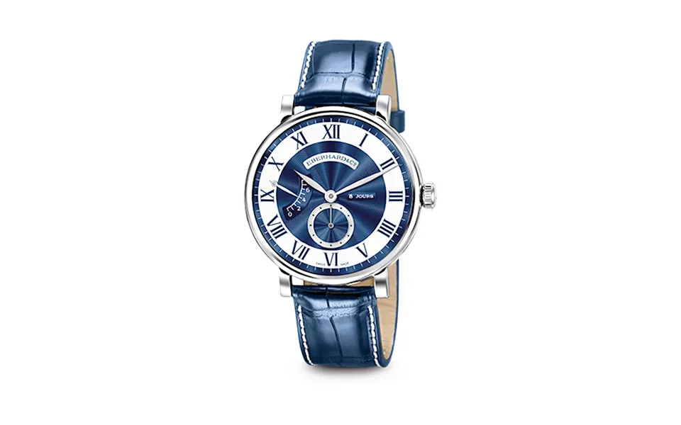 Collection: 8 jours grand taillesize: 41 mmcolor: blue with white hours round with roman numerals, satin steel handscase: steel with glass sapphire anti-scratch, anti-reflective and...show more
