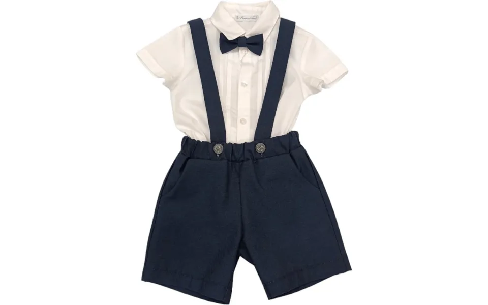 Completo 3 pezzi elegante, composto da bermuda salopette blu con camicia bianca a manica corta e papillon blu abbinato. Brand: barcellino