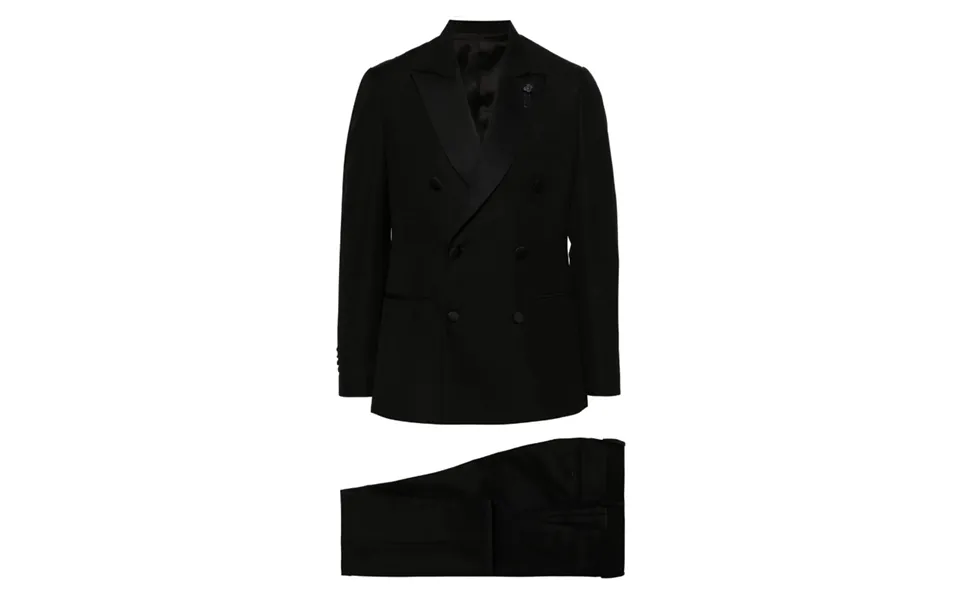 Model with logo pin detail, pointed lapels, double-breasted closure with covered buttons, shoulder pads, long sleeves, covered buttoned cuffs, welt pocket on the chest, two...show more