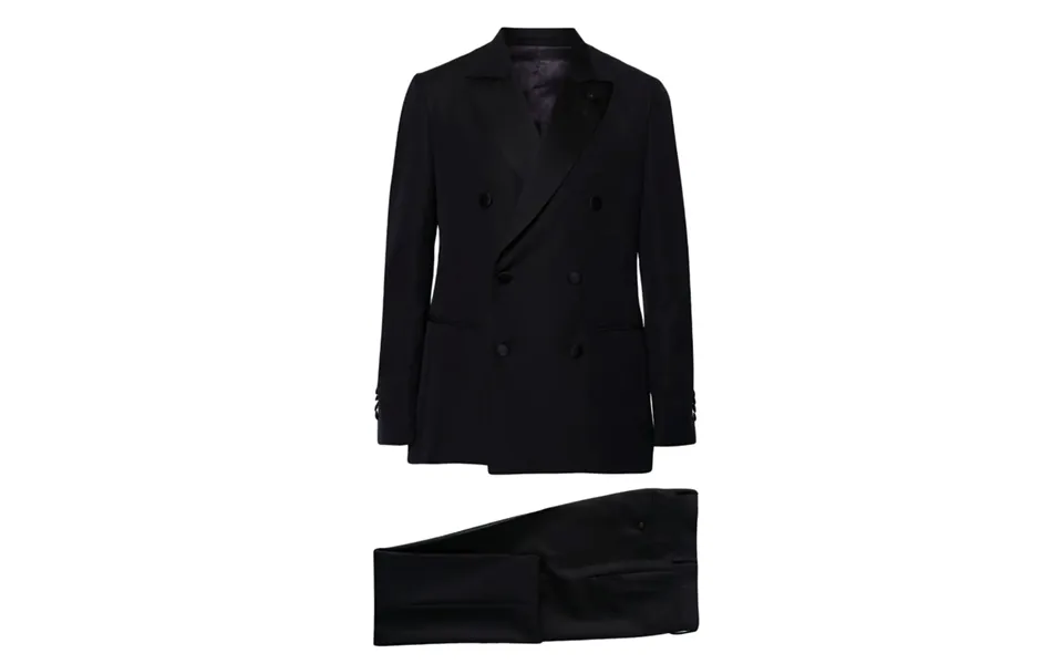 Model with logo pin detail, pointed lapels, double-breasted closure with covered buttons, shoulder pads, long sleeves, covered buttoned cuffs, welt pocket on the chest, two...show more