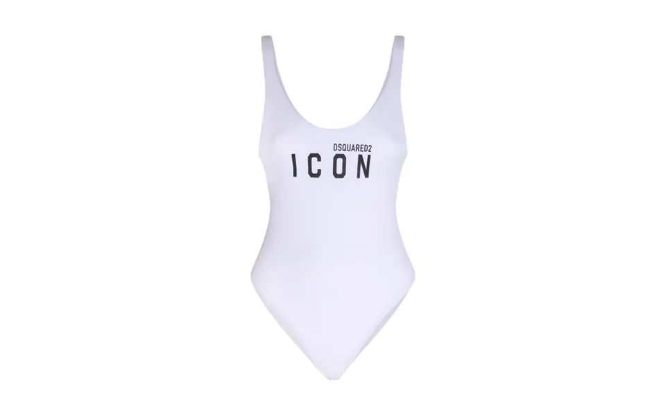 White icon swimsuit from dsquared2 featuring stretch-design, signature icon motif, thin shoulder straps, scoop neck, scoop back and high cut. Remember to try on swimsuits...show more