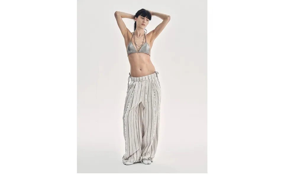 Design linen striped wide-leg pants with lace trim and drawstrings, suitable for both lazy vacations and the stylish urban environment. Exquisitely crafted jacquard stitching on...show more
