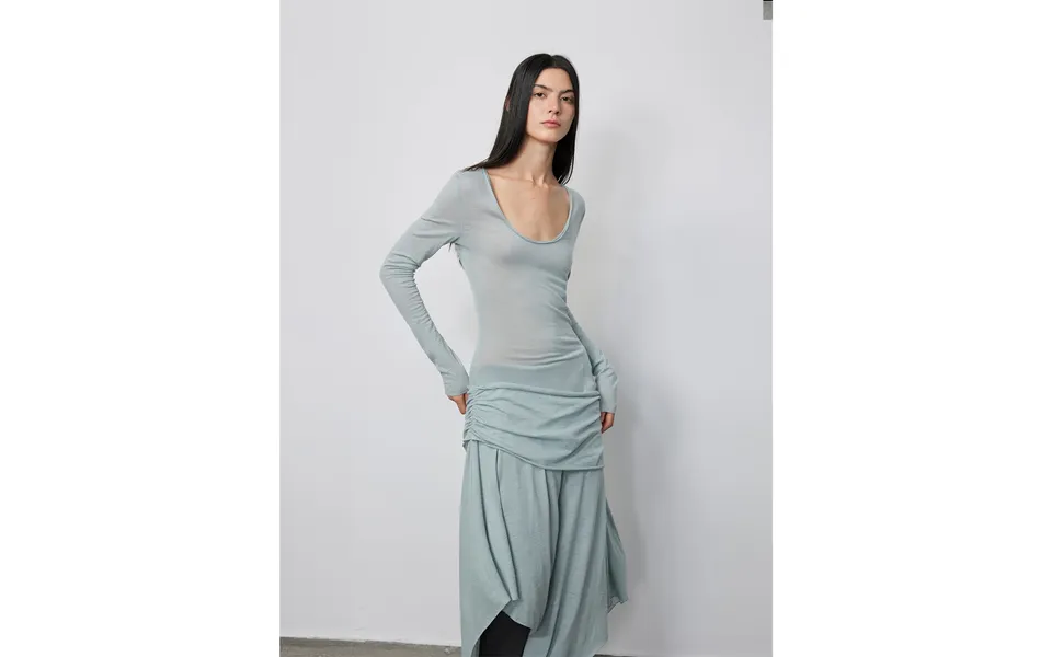 Tailored fit u-neck draped waist irregular design long dress creates a slim and flattering silhouette, effortlessly stylish. The irregular hemline dress features smooth, flowing lines...show more