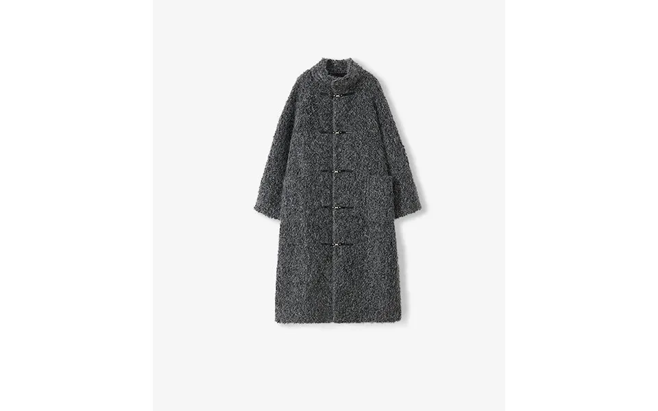 Imported mohair blend circle texture coat with stand collar and leather toggles made with south african imported mohair blended with virgin wool, this coat features a three-dimensional, plush circle texture. It is fluffy, full, and drapes beautifully, offering both warmth and style. The stand collar design provides wind protection, while the black leather loops and silver toggles add a sleek, casual touch. The coat is crafted from premium imported wool, combining the relaxed, stylish feel of a trench coat with a sharp, sophisticated cut. It’s the perfect blend of chic, fashionable, and polished, creating a confident, elegant look. Fabric imported mohair and virgin wool blend circle texture, rich layers, full and luxurious feel this fabric is made from high-quality south african imported mohair blended with virgin wool, offering a plush, light, and warm feel. The polyester fiber blend in an optimal ratio enhances the fabric's strength and elasticity, ensuring smooth, drapey comfort. The garment's surface naturally carries a sense of layering, giving the piece a rich, full, and structured look. It combines elegance with a relaxed, chic vibe, making it both sophisticated and effortlessly stylish. Exclusive custom jacquard lining silky, lightweight, skin-friendly, and breathable, showcasing haute couture quality.