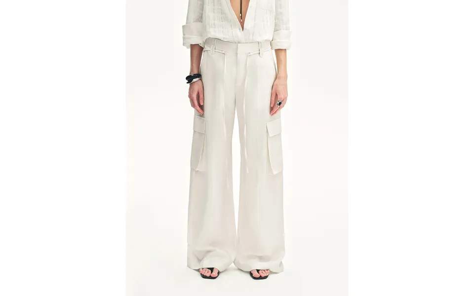 Design wide-leg pants with utility-style pockets and waist ties the pants feature a simple wide-leg silhouette. The smooth quilting lines modify the leg shape, making...show more