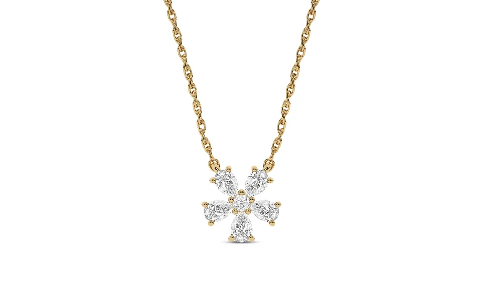 Five sparkling 14k yellow gold pear-shaped diamonds dance within a delicate frame, capturing the essence of a blooming flower. This enchanting pendant floats weightlessly on...show more