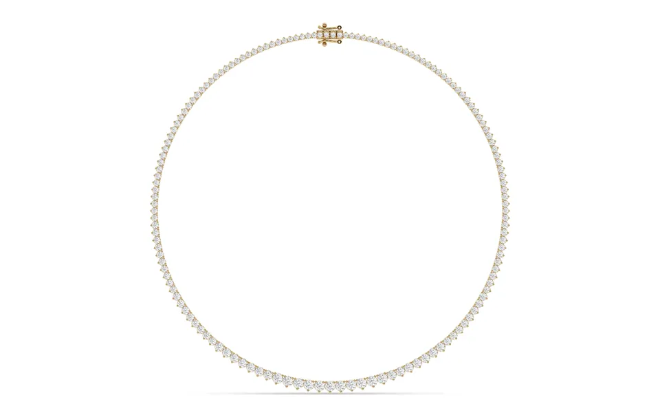 Graduating 14k yellow gold 12 carat round diamonds tennis necklace, each secured in a delicate 3-prong setting, cascade around her neck in a mesmerizing display...show more