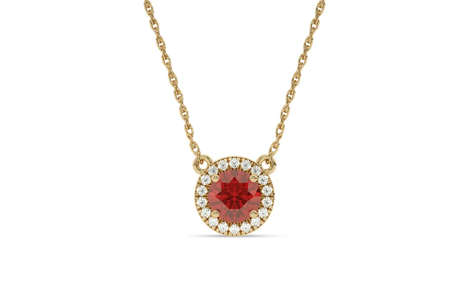 Elevate your neckline with the 10k yellow gold dynasty halo necklace. A 6.5 Mm round ruby, bathed in the brilliance of a diamond halo, creates...show more