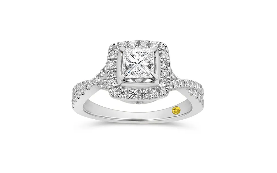 Solid gold whispers promises as a sparkling princess-cut diamond takes center stage, cleverly enhanced by a textured plate. A shimmering halo amplifies its brilliance, creating...show more