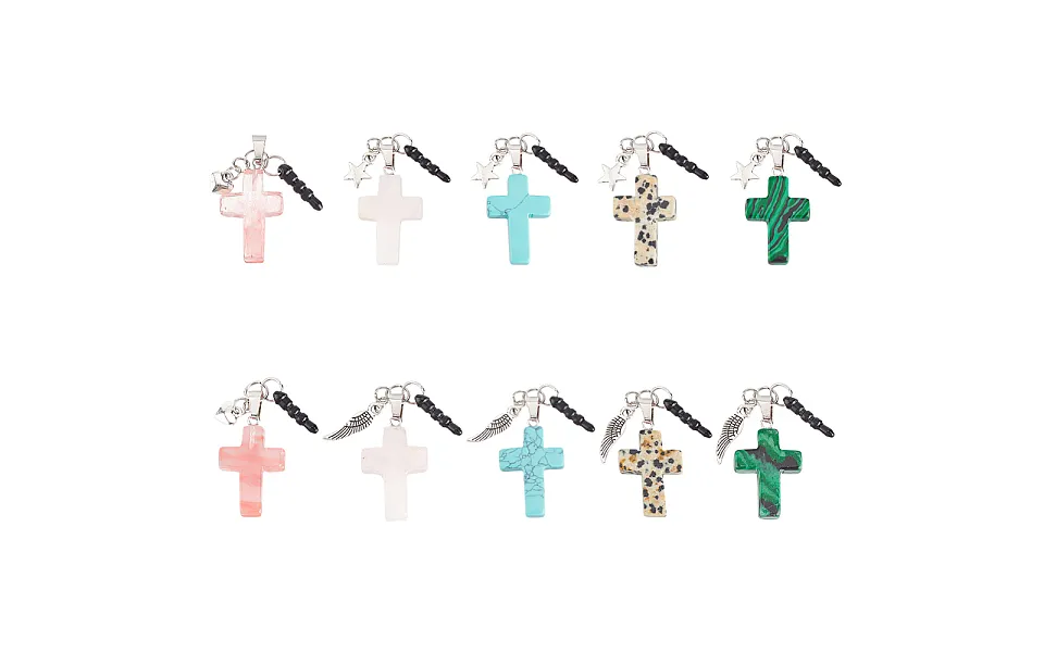 10Pcs plastic mobile dustproof plugs, with cross gemstone and alloy charms, wing star heart, antique silver size: about 60mm long, cross: 29 30x18 19x5 6mm,...show more