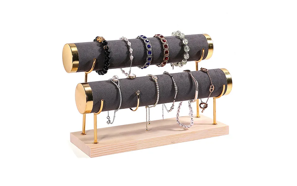 Velvet 2 t bar bracelet display rack, jewelry organizer holder with woode base, for bracelets watch storage, gray size: about 100mm wide, 290mm long, 185mm...show more