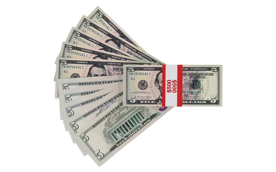 Our 500 full print new series prop money stack is comprised of one hundred 5 double-sided bills, offering unmatched quality and detail. Each bill is...show more
