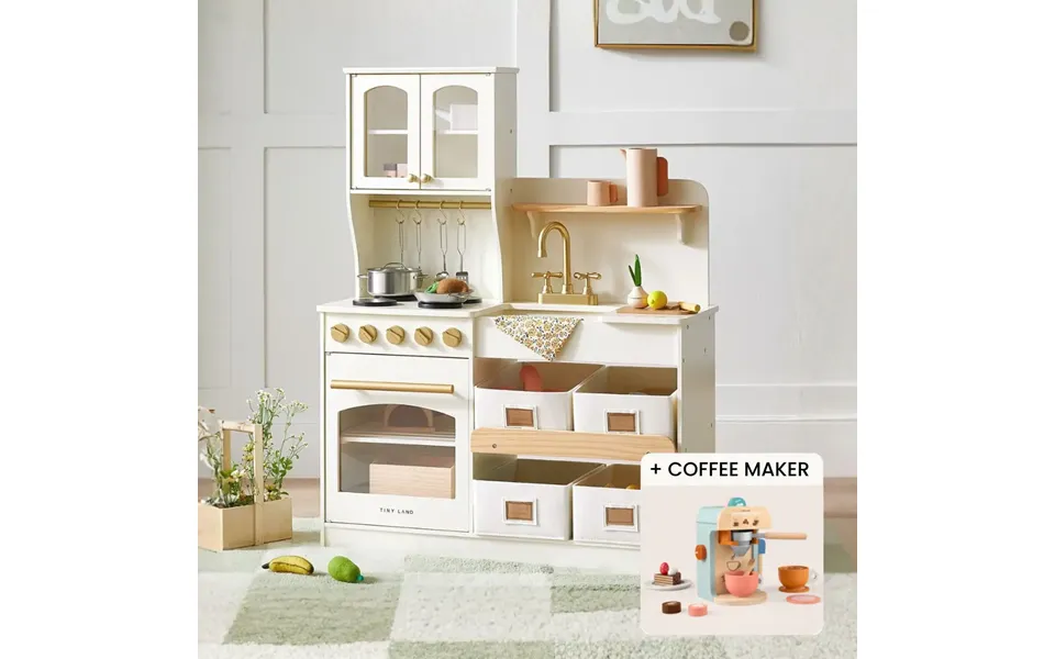 Inspired by peaceful cottage living, the sweetwood evergreen play kitchen brings gentle wood tones, soft greens, and timeless charm to your child’s pretend play world now paired with our wooden coffee maker set for the ultimate café-style experience, right at home. The smart storeage play kitchen a beautifully designed wooden kitchen featuring: realistic knobs, stovetop, faucet, and sink spacious cabinets for storage modern, nature-inspired color palette durable wood craftsmanship built for years of play perfect for whipping up imaginary breakfasts, lunches, and feasts the wooden coffee maker play set a delightful wooden espresso machine with: click-click-click simulation sound for immersive pretend brewing bright, eye-catching color design to spark curiosity smooth, rounded edges sanded surfaces for safe play crafted with care every piece is made using: durable, eco-friendly wood kid-safe, non-toxic paints smooth, rounded edges for maximum safety quality craftsmanship that lasts through years of play beautiful, safe, and built to be treasured. The complete culinary & café bundle from brewing pretend coffee to cooking delicious imaginary meals, this bundle transforms any playroom into a warm and lively kitchen café. A perfect gift for little chefs and baristas ready to cook, create, serve and most importantly have tons of fun.