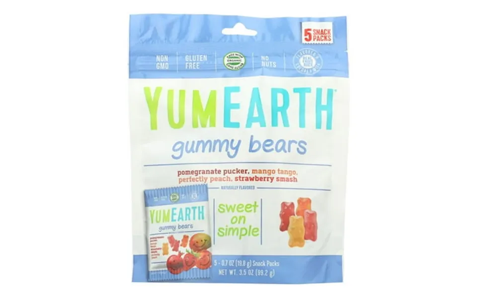 Case of 12 0.7 Oz. Details: yumearth gummy bears are an organically made candy. These 5 snack packs each have 4 fun flavors: pomegranate pucker...show more