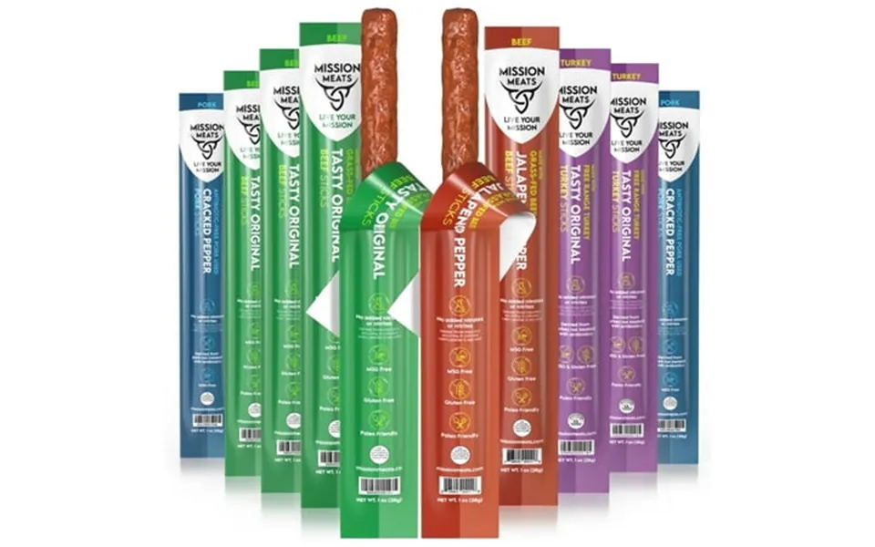 Mission meats variety pack with 100% grass fed beef free range turkey pepper pork sticks gluten & sugar free whole 30 and paleo 1oz pack...show more