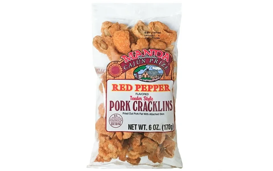 Manda red pepper flavored tender style pork cracklins are crispy airy fried pork fat with a fiery red pepper kick. Product sold in plastic packaging....show more