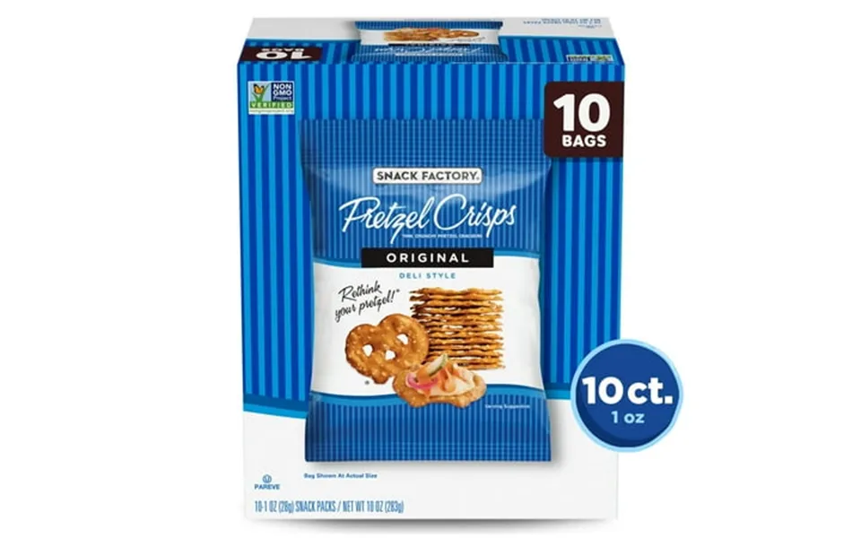 Snack factory original pretzel crisps are a modern twist on traditional pretzels. Baked thin and crunchy this snack is a tasty gourmet alternative to an...show more