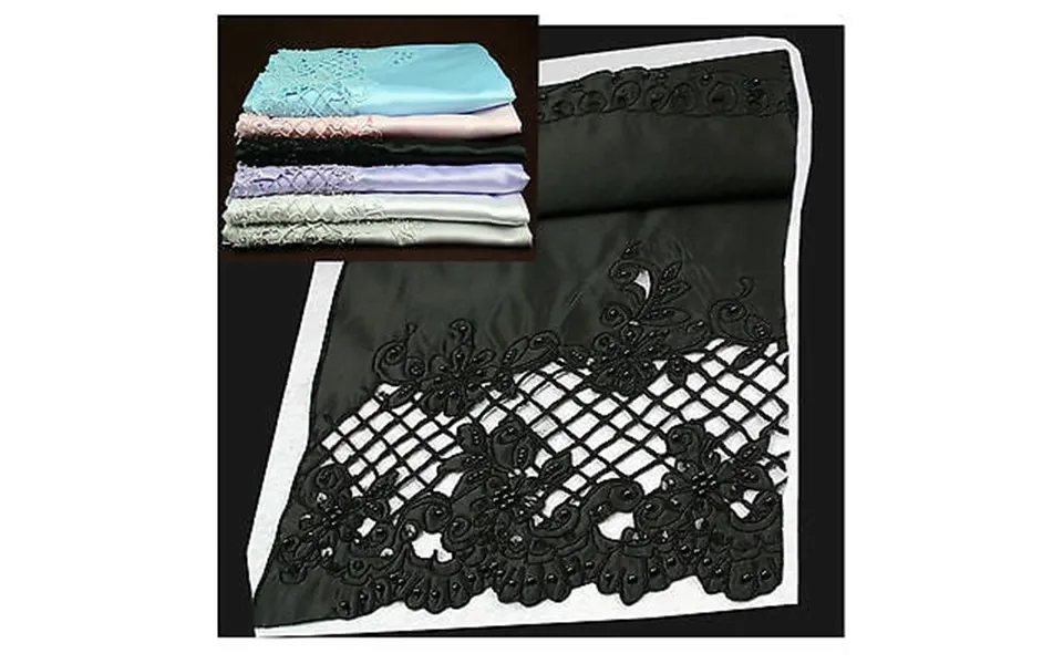 54-55 Embroidered satin fabricproduct features:55-56 wide6 color selections: blue pink black lilac white silver gray100% handmade beading cording and cut outscut outs on one side...show more