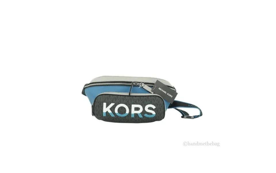 Style: michael kors cooper large embroidered logo utility belt blue material: pebbled leather and pvc features: 2 outer zip pockets 1 outer rear valuables zip...show more