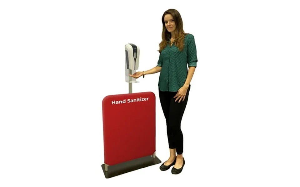 Automatic sanitizer dispenser floor stand kit. Includes aluminum stand steel base plate touch-free dispenser and double-sided clean your hands here graphic banner printed on american-knit...show more