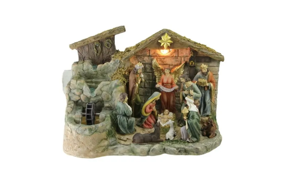 This serene scene of the nativity is complemented by the soft glow of light and gently moving water. This piece features the holy family an...show more