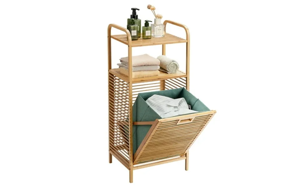 This our tilt-out bamboo laundry hamper with shelf this unique piece has a bamboo slatted frame with 2 storage shelves above the tilt-out hamper space....show more