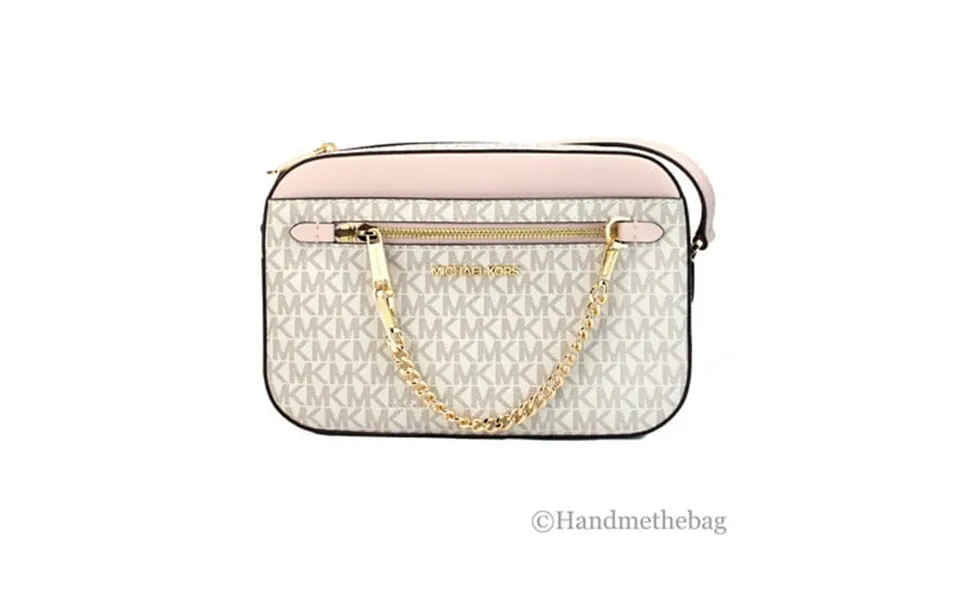 Michael kors jet set travel item zip chain crossbody bag vanilla powder blush. Mk signature in vanilla with powder blush leather accents gold tone hardware...show more