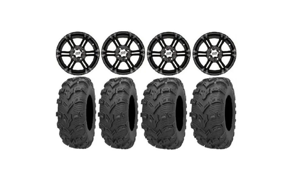 This wheel and tire kit includes: 4 itp ss212 black atv wheels front rear 12x7 4 110 5 2 12ss400 2 kenda bear claw evo...show more