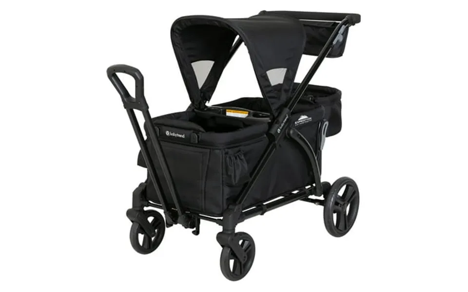 Get ready for your outdoor adventure with the exclusive baby trend expedition 2-in-1 stroller wagon plus designed with utility safety and style in mind the expedition 2-in-1 stroller wagon plus caters to families who love outdoor activities and exploration. It features a super large cargo space with built-in seating and two three-point safety harness belts ensuring your kids can explore safely. Little ones will enjoy the extra support provided by the versatile seat2mat. Additionally the extra-large ratcheting canopy with upf 50 plus protection and air-flow mosquito netting shields your little ones from harmful sun rays and rain. Parents will also appreciate the ultimate storage solutions which include parent and child trays with two cup holders and center consoles as well as two additional cup holders outside of the wagon. A flip-over basket can easily be attached to the front or rear of the wagon adding even more storage capabilities. The wagon is equipped with easy one-button removable 11-inch rear wheels and durable eight-inch front wheels for easy maneuverability. With the hideaway pull handle parents can effortlessly transform the push stroller into a pull wagon mode. The telescoping slim fold and the quick-release wheels allow the wagon to be easily stored and transported. Enjoy quality outdoor time with the whole family with the baby trend expedition 2-in-1 stroller wagon plus.