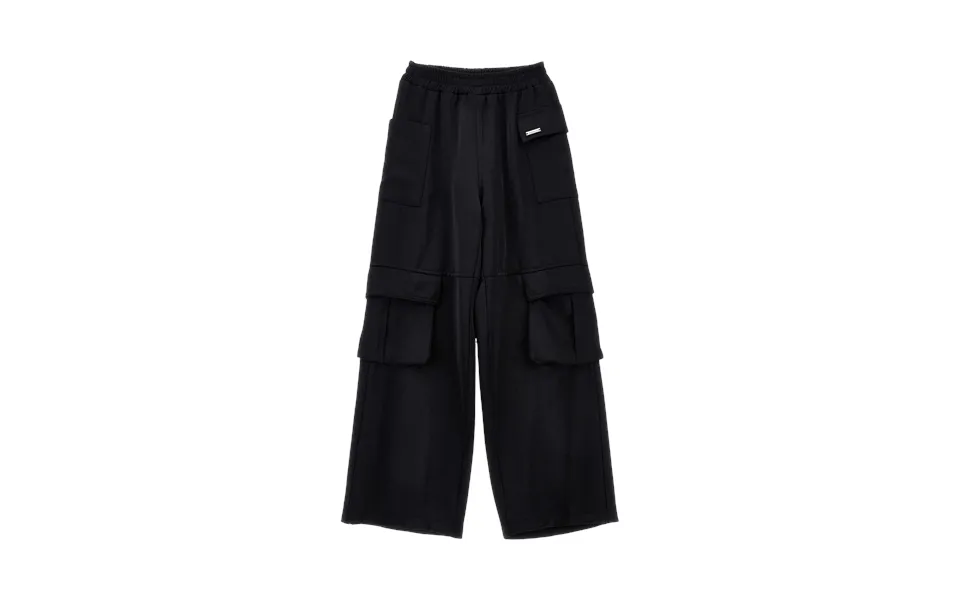 Trousers model cargo in satin fabric effect in viscose blend, wide leg, lining in cotton, elastic waist, side pockets embroidered with flap closure and embroidered...show more