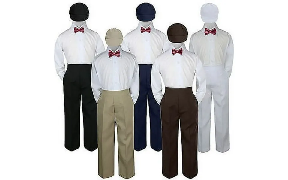 100% Brand new 4 pieces satin color vest suit setincluding in this listing:shirtpantsbow tiehatfeatures:5 color collectionthe long white shirt is made out 35% cotton 65% polyester fabric.The color coordinated pants a hidden fly zipper in the front belt loops and an adjustable elastic waistband in the interior of waist. There are angled pockets on each side of the pants and two buttoned welt pockets on the back. Note: baby and toddler sized s m l xl 2t 3t 4t pants do not have a fly zipper and belt loops only an elastic waistband.A color coordinated satin bow tie is included.Hat is also included.Our store carries the same style with the following color please click each picture to the color you prefer.Colors: green teal navy mustard champagne coral brown ivory eggplant dark gray gold yellow red black white silver royal blue purple lilac turquoise fuchsia burgundy orange lime and others.Brownburgundycoraldark grayeggplantfuchsiagoldgree