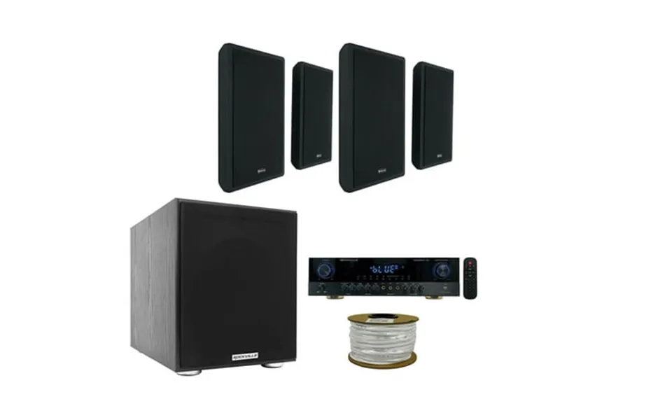 Package includes: 2 2 rockville rockslim black home theater 5.25 240W easy wall mount slim speakers 1 rockville singmix 5 2000w bluetooth dj pro karaoke home amplifier mixer receiver 1 rockville rock shaker 8 inch black 400w powered home theater subwoofer sub 1 rockville red 14g50 ofc 14 gauge 50 foot 100% copper speaker wire car audio video of rockslim black: features: pair of rockville rockslim black 5.25 240 Watt home theater slim speaker with easy wall mount brackets rms power handling: 40 watts per speaker 80 watts per pair peak power handling: 120 watts per speaker 240 watts per pair 5.25 Woofer with paper cone has natural sound reproduction with clear mids and bass 0.5 Mylar dome tweeter delivers pristine highs sensitivity: 89 db video of singmix 5: features: rockville singmix 5 2000 watt bluetooth amplifier mixer receiver speaker outputs supports 4 8 ohm speakers or 2 8 ohm speakers or 2 4 ohm speakers terminals are banana or bare wire a and b speaker selector options allows you to split the speakers to 2 zones and turn each zone on or off. When both zones are playing it will play in stereo built in bluetooth with 35 foot range usb input will play music files from a thumb drive or hard drive owner s manual video of rock shaker 8: features: rockville rock shaker 8 black 400 watt powered 8 home theater subwoofer 400 watts peak 200 watts rms built-in class d amplifier enclosure is made of top quality mdf wood. Mdf wood sounds better and lasts longer than particle boa...
