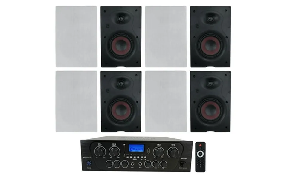 Package includes: 1 rockville rpa40bt 1000w 4 zone channel home stereo bluetooth amplifier receiver 4 pair rockville wa658 6.5 In-wall home speakers w kevlar woofer silk dome tweeter all about your rpa40bt: features: rockville rpa40bt 1000w 4 zone channel home stereo bluetooth amplifier receiver 4 independent channels zones each with volume control 4 mono zones or 2 stereo zones rms power 4 ohms: 62.5W x 4 peak power 4 ohms: 250w x 4 rms power 8 ohms: 40w x 4 peak power 8 ohms: 160w x 4 built in bluetooth with 35 foot range rear rca input rear optical input rear rca output for a powered sub or adding another amplifier 4 sets of oversized detachable speaker terminals for easy installation without head-banging euro-block plugs 2 1 4 mic inputs on front panel usb and sd inputs for music files from usb thumb drive and sd drive record output to mixer record output to connect a recording device bass and treble control knobs fm radio tuner with presets & auto-scan built-in pre-amplifier preset eq for bluetooth usb sd 2 band eq for other inputs remote control for mp3 module only remote does not control zone volume it only controls the bluetooth usb fm radio variable speed cooling fan input sensitivity: 300mv 20 kohm frequency response: 20hz