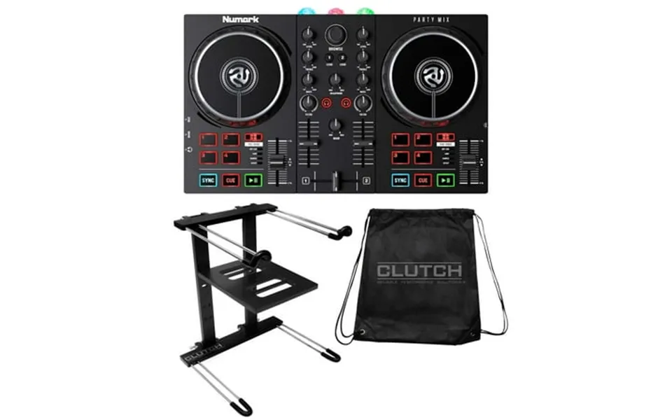 This package includes: 1 numark party mix ii dj controller with built-in light show 1 clutch cl-mls57 black laptop stand 1 laptop stand carry bag...show more