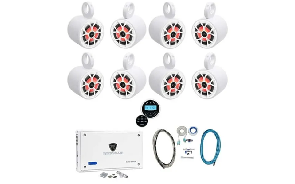 Package includes: 4 pairs of rockville rkl65mbw 6.5 700W marine boat speakers w led black white grilles 4 pairs of rockville mac65w 6.5 White aluminum wakeboard tower speaker pod enclosures 1 rockville rxm8btw 8 channel 1500 watt marine boat amplifier amp w bluetooth 1 rockville rmwk4 4 awg gauge waterproof marine amplifier amp install wire kit 4 rockville mrca20 20 foot twisted pair marine rca cable 100% copper split pin 1 rockville rghr2 marine gauge hole receiver w bluetooth usb radio wired remote video of rkl65mbw: features: pair rockville rkl65mbw 6.5 2-Way 700 watt marine boat speakers with led lights cea compliant power ratings power rating: 350 watts peak 85 watts rms per speaker total power: 700 watts beat sync led’s flash to the rhythm of the music owner s manual video of mac65w: *although the pre-drilled holes will accommodate most speakers on the market there may be some that don t fit. If that is the case you can drill holes into the lip of the can to line up with your speaker s mounting holes. Video of rxm8btw: owner’s manual video of rmwk: features: rockville rmwk4 4 awg gauge waterproof marine boat amplifier wire installation kit 20 ’ translucent twisted pair high quality tinned-ofc flexible pvc rca cable 18’ 4 gauge high current low impedance clear flexible power cable with 3’ black poly woven mesh to better resist chemicals in the battery compartment 18’ 4 gauge high current low impedance light blue flexible ground cable 25’ 16 gauge 100% tinned-cca whit...