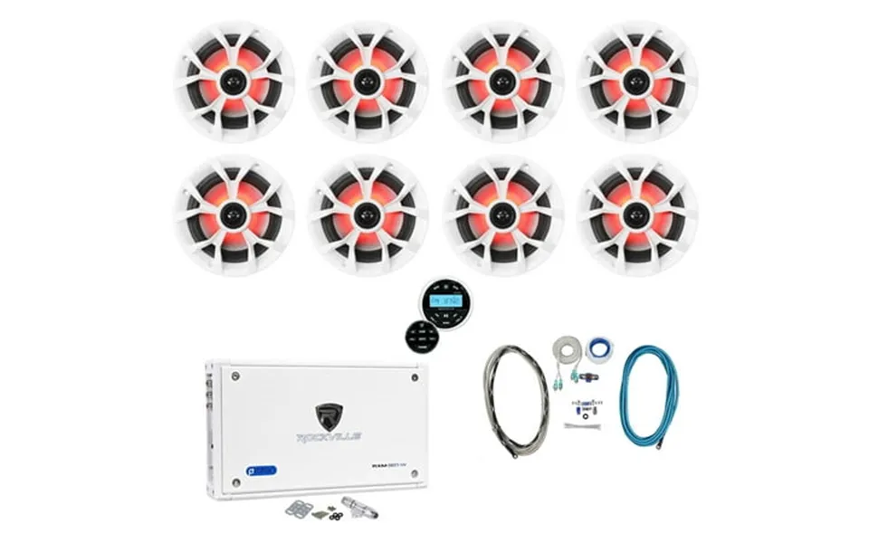 Package includes: 4 pairs of rockville rkl65mbw 6.5 700W marine boat speakers w led black white grilles 1 rockville rxm8btw 8 channel 1500 watt marine boat amplifier amp w bluetooth 1 rockville rmwk4 4 awg gauge waterproof marine amplifier amp install wire kit 4 rockville mrca20 20 foot twisted pair marine rca cable 100% copper split pin 1 rockville rghr2 marine gauge hole receiver w bluetooth usb radio wired remote video of rkl65mbw: features: pair rockville rkl65mbw 6.5 2-Way 700 watt marine boat speakers with led lights cea compliant power ratings power rating: 350 watts peak 85 watts rms per speaker total power: 700 watts beat sync led’s flash to the rhythm of the music owner s manual video of rxm8btw: features: rockville rxm8btw 8 channel 1500 watt marine amplifier w bluetooth white compact design and extremely high power do not be fooled by the compact size this amp is a beast 1500 watts peak system power 750 watts rms system power rms power output at 4 ohms: 65 watts x 8 channels cea rated rms power output at 2 ohms: 95 watts x 8 channels rms bridged power output at 4 ohms: 190 watts x 4 channels peak bridged power output at 4 ohms: 380 watts x 4 channels. Owner’s manual video of rmwk: features: rockville rmwk4 4 awg gauge waterproof marine boat amplifier wire installation kit 20 ’ translucent twisted pair high quality tinned-ofc flexible pvc rca cable 18’ 4 gauge high current low impedance clear flexible power cable with 3’ black poly woven mesh to better resist c...