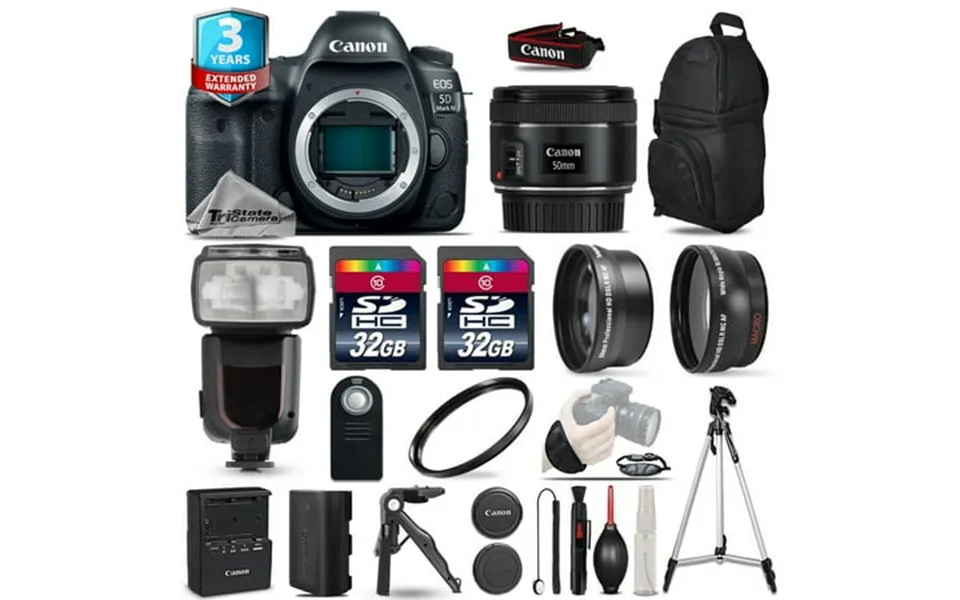 Tristatecamera saving bundle includes: canon eos 5d mark iv dslr camera 1483c002 canon ef 50mm f 1.8 Stm lens elite series digital slr auto-focus power zoom flash with lcd display bounce swivel for canon dslr black 2 of 32gb class 10 sdhc flash memory card 0.43X wide angle lens w macro portion 2.2X photo professional telephoto hd lens cps 3 year extended protection warranty for digital camera dual 6.5 Mini table-top tripod & pistol grip 58mm uv protection filter professional tripod for digital slr camera backpack for dslr system black wireless remote control pen pocket cleaning brush professional wrist grip strap air blower cleaner 49-58 step up ring deluxe cleaning kit for dslr cameras what s in the box: lp-e6n lithium-ion battery pack 7.2V 1865mah lc-e6 charger for lp-e6 battery pack eyecup eg rf-3 body cap ifc-150u ii usb 3.0 Interface cable cable protector wide neck strap software cd-rom please note:this is an international model product. Manufacturer s warranty is not applicable. Please see warranty section for more details.