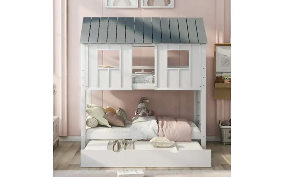 Make your bedroom the envy of all the bedrooms with this product. This bed frame will transport you to the outdoors with its playful design and will certainly be the center of attention when the friends come over for a sleepover.Crafted from pinewood and mdf it includes slat kits that alleviate the need for a box spring its a great bed for resting but also for play as they design the beds with your safety in mind. Add some modern flavor to the bedroom with the white color finish it blends well against a light surface. This bed’s unique design not only creates more space for you but will also add fond memories of playtime and sleepovers. Description material: pine wood mdf size: twin twin color: white numbers of package: 3 spring box: no need assembly required: yes origin: vietnam dimensions overall product dimension: 79.6 L*81.6 W*91.8 H package dimension: please refer to the specification bed dimension: 75 x 38.6 Trundle dimension: 74.4 X 38.6 Total height: 91.8 Overall product weight: 190lb weight capacity of upper down trundle bed: 250lb recommend bunk bed mattress thickness: 6 recommend trundle mattress thickness: 4