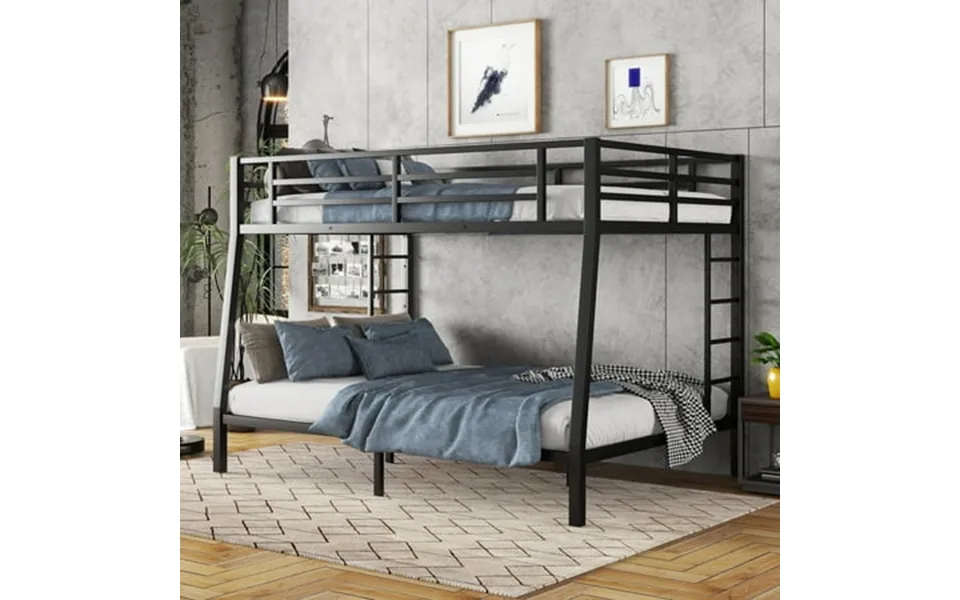 Kacho metal full xl over queen bunk bed for teens and adults key features: full xl over queen noise-free bunk bed: crafted with heavy-duty steel slats the kacho full xl over queen bunk bed offers exceptional durability and sturdiness. Equipped with noise-reducing rubber stoppers that firmly secure the slats preventing any noise from moving parts. 2 Side ladders & raised guardrails: features two wider side ladders on the left and right for easy access to the upper bed. Full-length guardrails around the upper bed prevent falls ensuring a safer sleeping environment. Safety features: reinforced ladders ensure safer climbing . The low bunk design increases the activity space between the upper and lower beds reducing the risk of head bumps with a 40 height between them. Note: this bunk bed cannot be converted into two single beds. Space-saving design: ideal for saving space combining two beds into one. Provides a spacious 9.4 High storage space at the bottom for convenient storage solutions creating extra study and play space. Easy assembly: comes with detailed instructions and numbered parts for straightforward and convenient assembly. Note: this bunk bed will arrive in two boxes. Product description: the kacho metal full xl over queen bunk bed is designed for both teens and adults providing a perfect solution for space-saving and noise-free sleeping arrangements. Crafted from heavy-duty steel this bunk bed ensures lasting durability and sturdiness with noise-reducing rubber s...