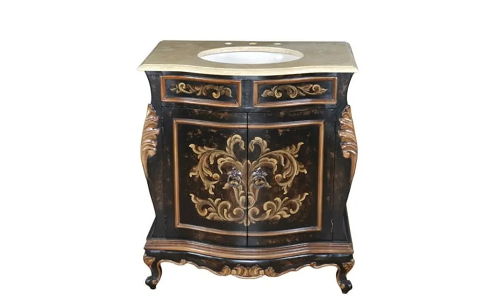 Dorado vanity the dorado vanity is a 33 wide single bowl vanity. The vanity is beautiful and decorative as well as designed to make installation as easy as possible. It comes with a mounted beige solid travertine marble top with pre-drilled holes for faucets a mounted porcelain bowl and the back was designed with an opening to allow for easy plumbing hook-ups. This collection boasts a spanish influence with its large scaled details in a popular finish of deep rustic browns featuring a contrast of distressed black and delicately detailed with hand-painted soft scrolls. Consider ordering 2 for a large master bath application. The dorado vanity s is part of our santa lucia collection consisting of handmade hand-painted and distressed solid wood furniture making each piece a timeless investment. Handcrafted treasures made one piece at a time under one roof by our exclusive family owned manufacturer from lima peru. Their master artisans are skilled in furniture making techniques influenced by the spanish during the colonization of peru. Many items in the diverse collection feature specialty hand-painted finishes that have also been passed on and perfected from generation to generation. The family strives to be environmentally friendly by using woods re-purposed from haciendas and old colonial homes as well as wood indigenous to south american forests primarily mahogany cedar moena and require. If you are a lover of beautiful painted furniture find hill country rustic romantic ...