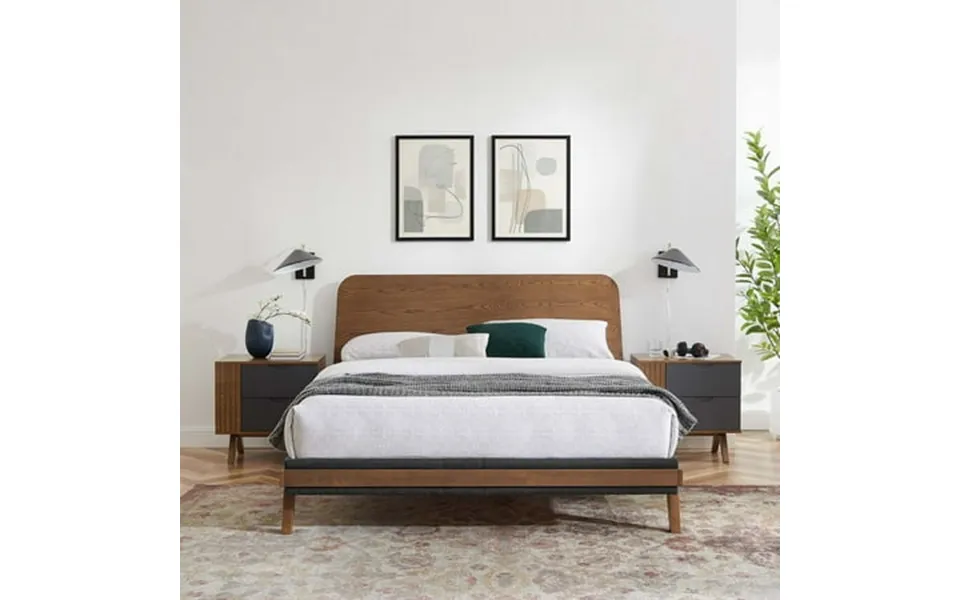 Reinvent your bedroom decor with the dylan 3-piece bedroom set. Abounding in mid-century style and contemporary modern design this platform bed features beautiful wood grain detail and rounded edges. The two nightstands are complete with full-extension drawers that provide ample storage space for bedside essentials. With fabric upholstery lining the frame this platform bed is crafted with mdf and wood grain veneer to create its stunning organic aesthetic. A wood slat support system eliminates the need for a box spring and encourages ample air circulation to your mattress. A lasting mattress foundation this platform bed features a sturdy rubberwood construction with a reinforced center beam support legs and felt foot pads to protect your flooring. This queen bed accommodates the various mattress types on the market such as memory foam spring latex and hybrid. Mattress not included. Weight capacity: 800 lbs.