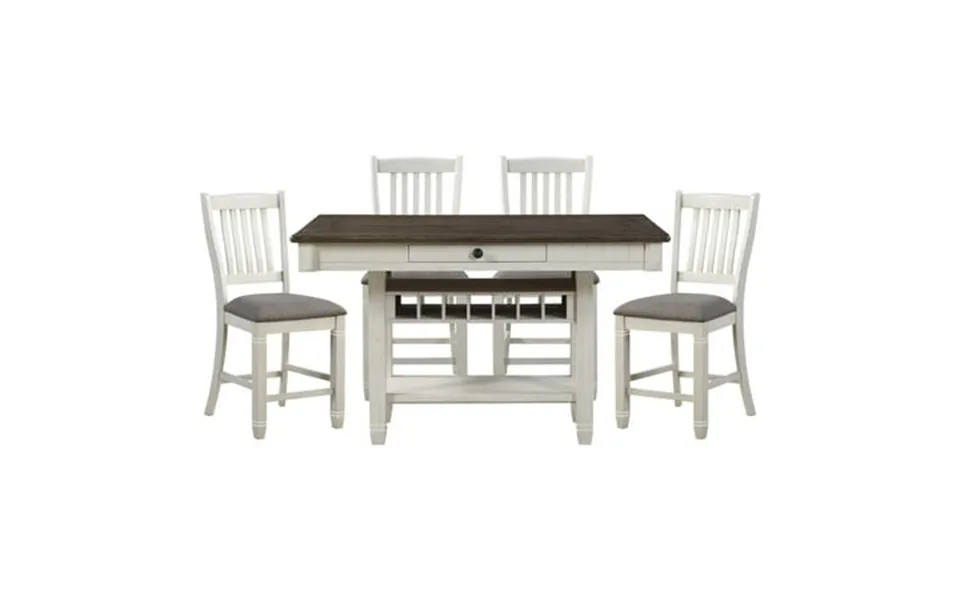 Product description:- inspired by the aesthetic of a casual country kitchen this collection is an inviting gathering spot for mealtime with family and friends. 36-Inch counter height with 4 drawers on the apron and storage display shelf base. The two-tone look of the acacia and pine solids base finished in antique white and the elm veneer of the table’s top finished in a rosy brown present as a harmonious combination of color. Product dimensions:- table: 60 x 40 x 36.5 Chairs: 19.5 X 24.5 X 42.5 Apron to floor: 30.5 Drawer interior: 18.5 X 12 x 1.5 4 Shelf interior: 31.5 X 17.5 X 12 1 seat width: 19 seat depth: 18 seat height: 24.5 Listing includes :- 5pc dining set 1 counter height table and 4 counter height chairs only. Simple assembly requires. Shipment service: shipping service include curb side delivery with free lift gate service. Note : no inside home delivery. Shipment will take around 8-14 business days features:- dining set includes dining room counter height table and 4 counter height chairs made of oak and rubberwood veneer wood and engineered wood 2-tone finish: antique white and rosy brown table includes 4 dovetail drawers with ball bearing glides and 7-bottle wine rack fabric upholstery counter height design seats 4 fabric type: textured fabric color: gray fabric content: 100% polyester