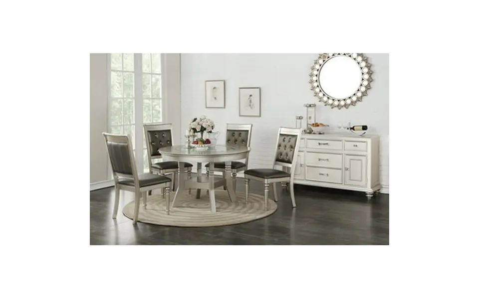 Product description:- enhance your sophisticated taste by complementing your dining room with the silver round dining table set. This set is skillfully crafted from solid wood with veneers and comes in silver finish. Featuring a sleek transitional design with a round table top a unique pedestal table base with an accent display shelf. The chairs feature cushioned tufted backs seats that are upholstered. Product dimensions:- dining table: 48 x 48 x 30 h side chair: 21 w x 24 d x 42 h listing includes :- dining table and 4x side chairs only. Shipping include curb side delivery no inside home delivery. Simple assembly require. Shipment will take around 8-14 business days product features:- contemporary style silver hues grey finish cushioned seats tufted upholstered rubberwood mdf veneer button tufted extra comfortable chairs round table top