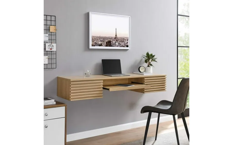 Tap into mid-century aesthetics with the render wall mount office desk. This wall-mounted office desk features a durable particleboard frame with a smooth walnut grain...show more