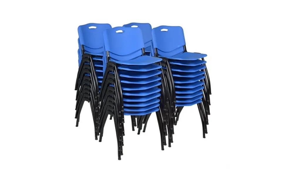 M stack chair 40 pack - blue the m stack chair by regency offers durability style and value. This sturdy lightwieght stack chair is ideal for cafeterias lunch rooms and break rooms and is available in blue black burgundy and grey finishes. Its black metal frame and contoured plastic seat and back are strong and easy to clean. This versatile stack chair easily stores away in stacks of 12 and features a built in handle for easy mobility. The m ships assembled and is ready to use right out of the box. All regency chairs are backed by a 5-year limited manufacturer s warranty on chair bases and frames. Set of 40 blue m stack chairs contoured plastic seat and back with built-in carrying handle for easy mobility easily stores away in stacks of 12 no assembly required seat height: 17 from floor seat dimensions: 18 w x 16 d