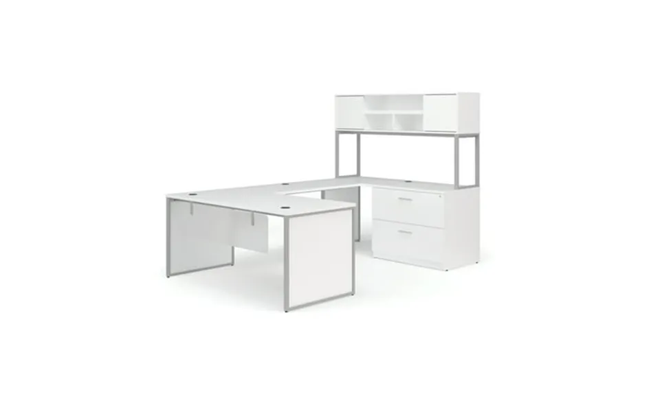 One series limitless possibilities. The anchor piece in this set is the ofm fulcrum series 66 by 30 modern office desk. The open concept table top provides plenty of work station room. The cable management cutouts allow for office organization and reduction in clutter. The bridge creates additional desk space and a u-shaped desk formation. The bridge adds a 48 desk extension for a substantial amount of extra room. The 66 by 24 credenza desk creates additional workspace. Providing safety and security the locking file cabinet comes with a key. Featuring a solid top the 2 drawer filing cabinet also provides additional workspace. The modern hutch features 3 center shelves providing a display area and 2 sliding doors providing covered office storage space. The leg panel insert can combine with the desk or credenza to provide subtle coverage for privacy. All pieces feature metallic accents with a bright white finish that combines rustic and industrial design elements that compliment any office decor. The 60 and 48 frosted plastic modesty panels allows you privacy while maintaining a modern open office look.