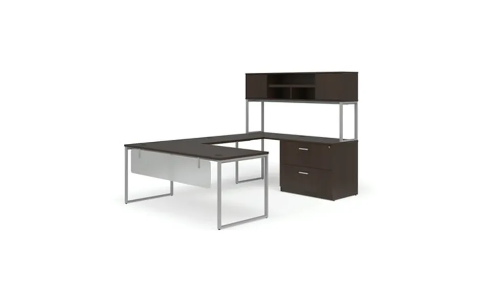 One series limitless possibilities. The anchor piece in this set is the ofm fulcrum series 72 by 30 modern office desk. The open concept table top provides plenty of work station room. The cable management cutouts allow for office organization and reduction in clutter. The bridge creates additional desk space and a u-shaped desk formation. The bridge adds a 48 desk extension for a substantial amount of extra room. The 72 by 24 credenza desk creates additional workspace. Providing safety and security the locking file cabinet comes with a key. Featuring a solid top the 2 drawer filing cabinet also provides additional workspace. The modern hutch features 3 center shelves providing a display area and 2 sliding doors providing covered office storage space. All pieces feature metallic accents with a warm espresso finish that combines rustic and industrial design elements that compliment any office decor. The 72 and 48 frosted plastic modesty panels allows you privacy while maintaining a modern open office look.